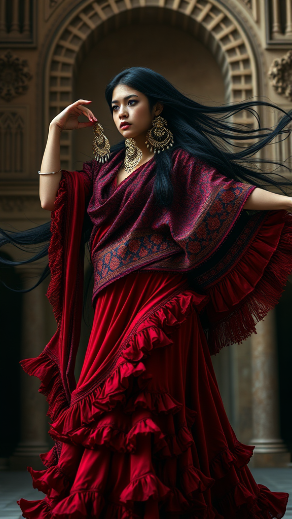 Four elaborate giant earrings adorn the subject's ears, cascading through her flowing black hair as she wears a very long dress. A massive shawl, with intricate patterns, wraps around her shoulders, complementing her bata de cola adorned with numerous frills and flounces, all in a striking red-black palette. The Mudéjar style and Romanesque architecture form an evocative backdrop, capturing her in a dynamic dancing pose. This portrait exudes passion, grace, and deep emotion, with an epic composition that integrates elements of tribal dark fantasy. Dramatic shadows enhance the mood, echoing the signature style of Fabian Perez.