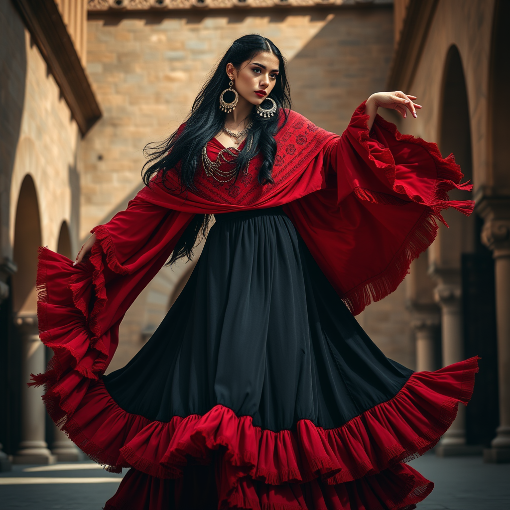 Four elaborate giant earrings complement her black hair, cascading past an extremely long dress. The ensemble is accentuated by a massive shawl, featuring a bata de cola with frills and flounces in a striking red and black palette. She strikes a dynamic dancing pose against a backdrop of Mudéjar-style and Romanesque architecture. The portrait exudes passion, grace, and emotion, capturing an epic composition infused with tribal dark fantasy elements. Dramatic shadows play across the scene, reminiscent of a work by Fabian Perez.