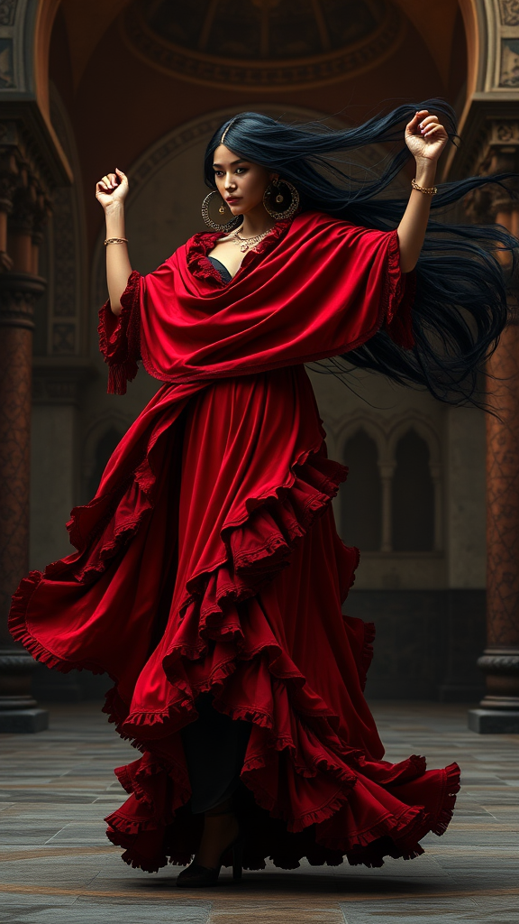 Four intricate giant earrings, complemented by flowing black hair and a very long dress, set the stage for an artistic expression. A large shawl drapes elegantly over the shoulders, integrated with the iconic bata de cola, adorned with frills and flounces in a captivating red-black palette. The backdrop features Mudéjar style and Romanesque architecture, framing a dynamic dancing pose. This striking portrait captures an epic composition filled with passion, grace, and emotion, enhanced by tribal dark fantasy elements and dramatic shadows, reminiscent of the evocative style of Fabian Perez.