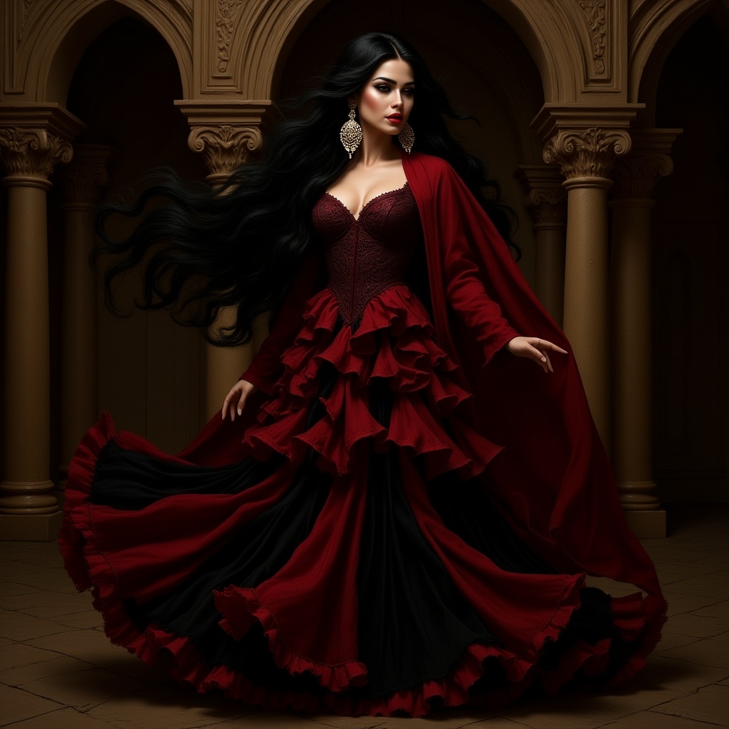 Four intricately designed giant earrings adorn a woman with flowing black hair, perfectly complementing her very long dress. The scene features a massive shawl draped elegantly over her shoulders, the garment's bata de cola cascades with vibrant frills and flounces in a striking red-black palette. Surrounding her is the majestic backdrop of Mudéjar and Romanesque architecture, enhancing her dynamic dancing pose. The portrait captures a moment of passionate grace, blending the emotional depth and epic composition characteristic of tribal dark fantasy. Dramatic shadows cast an aura of mystery and intensity, reminiscent of a piece by Fabian Perez.