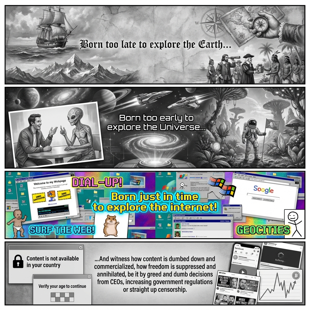 Four panel vertical comic. Panel 1 (greyscale): collage of painting style images embodying the spirit of the exploration: wooden ship sailing the ocean, mountain range, a hand holding a map and a compass, a group of explorers interacting with friendly natives. Text in the middle of the first panel says "Born too late to explore the Earth...". Panel 2 (greyscale): collage of semi-realistic images embodying the spirit of the deep space: futuristic space vessels exploring the galaxy, hologram of a spiral galaxy, photo of a man chatting with a friendly alien, astronaut in a futuristic space suit exploring a lush alien planet. Text in the middle of the second panel says "Born too early to explore the Universe...". Panel 3 (colourful): collage of images depicting the old school internet: screenshots of 90s-early 2000s websites, webcore vibes, memes. Text in the middle of the third panel says "Born just in time to explore the internet!". Panel 4 (greyscale): collage of images depicting the modern internet: sleek and buggy UI, screenshots of youtube clickbait videos, graph of crypto coin bouncing up and down, window that says "Content is not available in your country", dialogue box that requests user to verify their age. Text in the middle of the third panel says "...And witness how content is dumbed down and commercialized, how freedom is suppressed and annihilated, be it by greed and dumb decisions from CEOs, increasing government regulations or straight up censorship.".