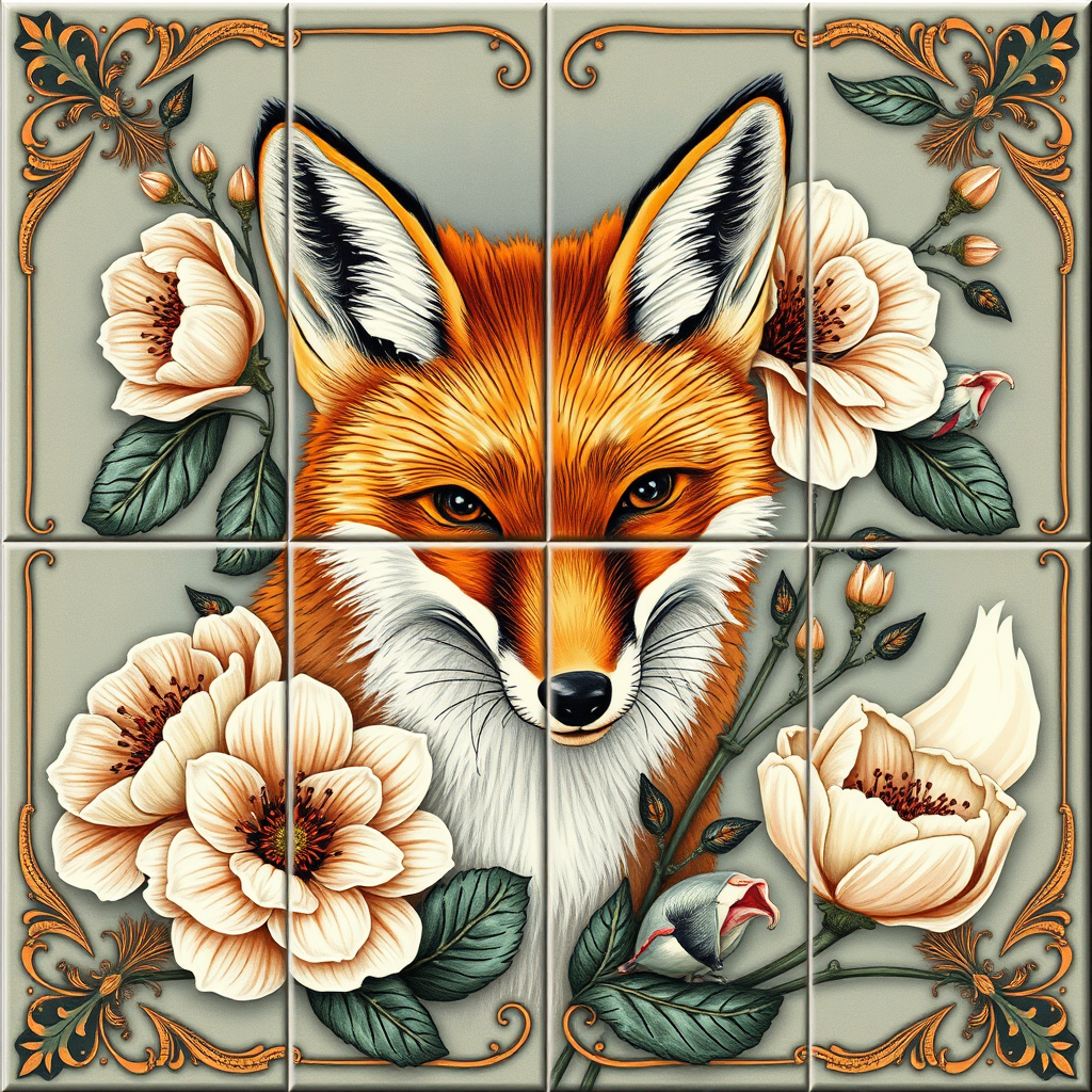 Fox ceramic tile artwork featuring exquisite flowers, intricate and elegant with meticulous detailing. Concept art inspired by the styles of Artgerm, Greg Rutkowski, and Alphonse Mucha, showcasing a smooth and focused composition. Designed in ultra-high definition with HDR quality, delivering a striking 16K resolution. Emphasis on natural form and balance, avoiding disfigurements or distortions. Captures realism without cloned elements or unfavorable alterations. Clear, high-quality imagery free from low resolution artifacts, out-of-frame issues, and distractions like watermarks, logos, or text overlays.