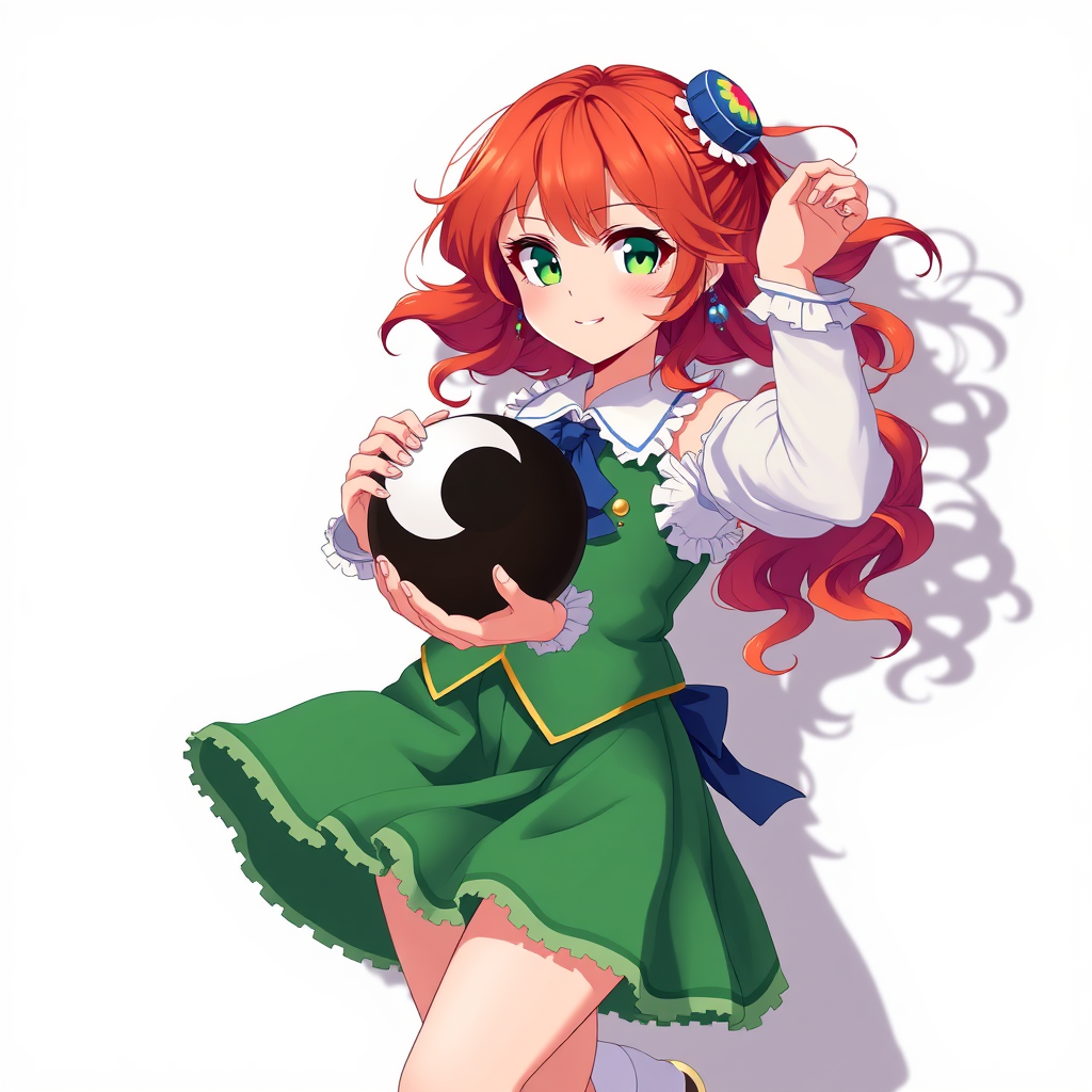 Fractal art, a single girl with wavy, Red-Auburn hair and green eyes, joyfully dancing. The scene captures her in a vector style, focusing on her solo presence. She wears an ascot, with bare shoulders and a subtle blush on her cheeks. Her attire includes detached sleeves and a flat chest, accompanied by frilled hair tubes and a frilled shirt collar. Her ensemble is adorned with frills throughout, showcasing a full body depiction as she gracefully holds an orb. She wears kneehighs, long sleeves, and a green skirt paired with a green vest, accented by a shadow that enhances the imagery. Her smile is engaging as she gazes at the viewer, clasping a yin yang orb. Her attire includes socks, a vest, and notably wide sleeves, complemented by a blue ascot. This masterpiece of vivid colors is rendered in ultra-realistic detail, designed to be an 8k CG unity wallpaper with the best quality, UHD, and HDR. The composition remains clear, focusing solely on the core elements, avoiding any out-of-frame issues, blurry visuals, or unwanted artifacts.