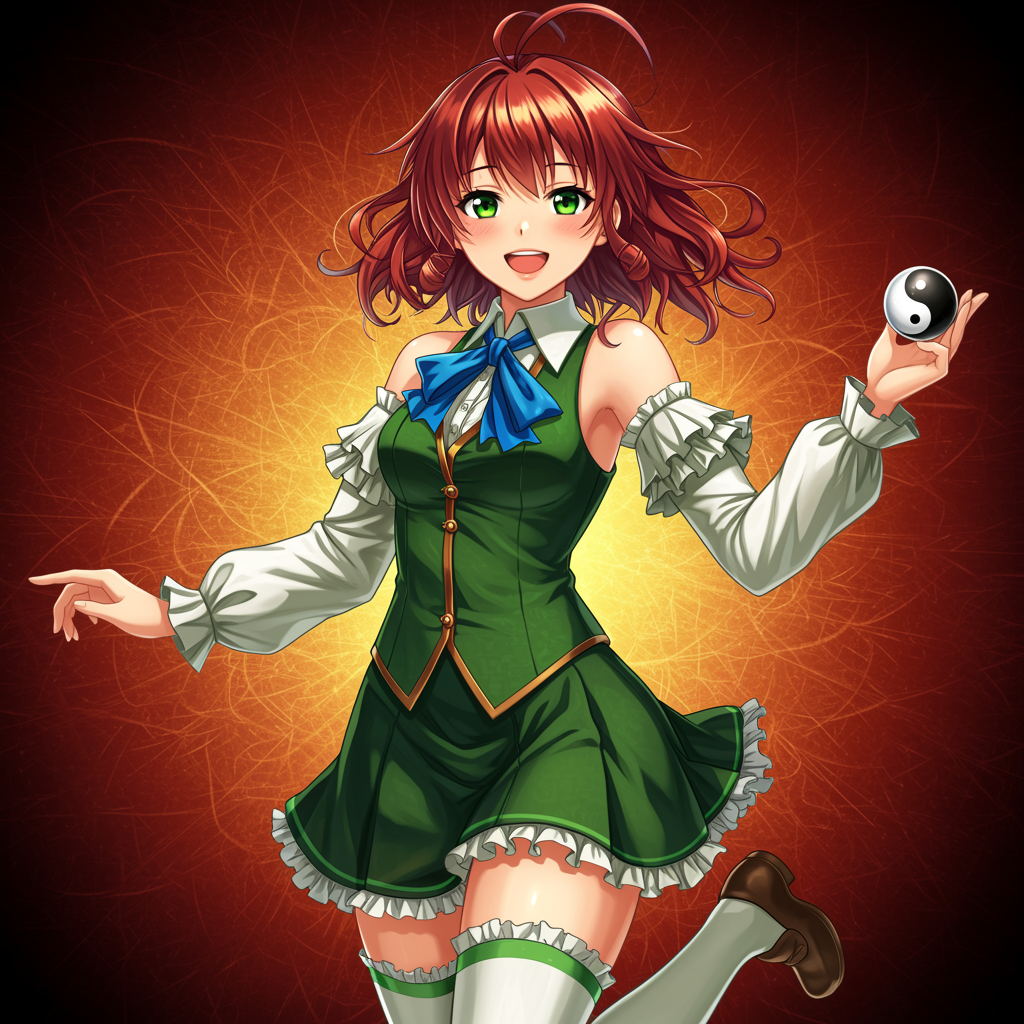 Fractal art, a single girl with wavy, red-auburn hair and green eyes, dancing joyfully. Vector style illustration showcasing her in solo, dressed in a green vest and skirt, with an elegant blue ascot. She has bare shoulders and features blush, with frilled hair tubes and a frilled shirt collar. Her outfit includes detached sleeves and wide, long ones. The girl is flat-chested, adorned with frills, and is holding an intriguing yin yang orb. The full-body depiction highlights her kneehighs and socks, as she looks at the viewer with a warm smile. The background is enhanced with vivid colors, ultra-realistic and extremely detailed, creating a masterpiece quality 8k wallpaper in UHD and HDR. The scene is thoughtfully crafted to exclude any visual distractions like duplicate or mutated elements, ensuring a clear, high-resolution coherence free of imperfections like low resolution, out-of-frame features, or blurry artifacts.