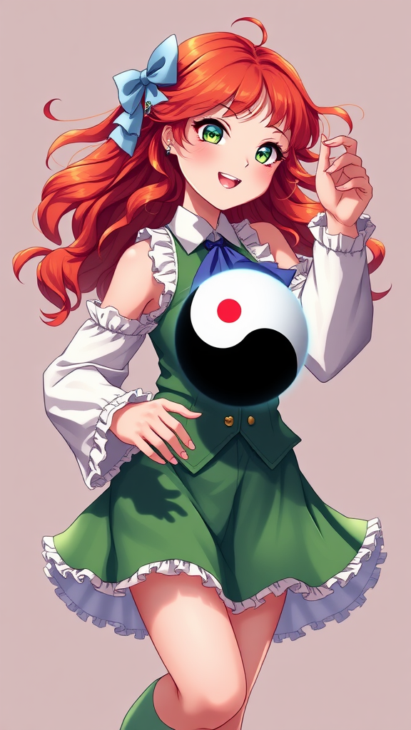 Fractal art of a single girl with wavy, red-auburn hair and green eyes, joyfully dancing. She is depicted in vector style, showcasing her bare shoulders with a playful blush. She wears detached sleeves, a frilled shirt collar, and frilled hair tubes. Her full attire includes a green vest and skirt, complemented by a blue ascot. The girl holds a yin-yang orb, casting shadows as she smiles and looks at the viewer. Her outfit features kneehigh socks and wide long sleeves, with a hint of a petticoat and bare shoulders. The piece is a masterpiece of ultra-realistic, vivid color design, created for an extremely detailed CG unity 8k wallpaper, showcasing the best quality in UHD and HDR. The girl appears in full body with an emphasis on expression and dynamic motion, free from any duplicates, mutations, or other distortions. The image avoids any artifacts, logos, or text, presenting a clear, immersive visual experience.
