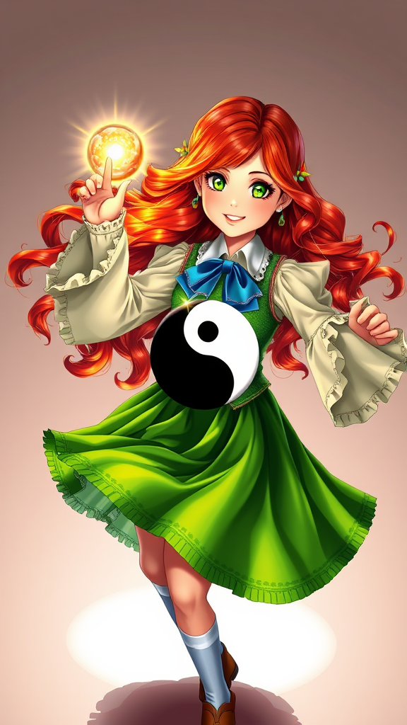 Fractal art style featuring a joyful solo girl with wavy red-auburn hair and captivating green eyes. She is dancing gracefully in a detailed 8k vector style wallpaper, showcasing an ultra-realistic masterpiece. Her ensemble includes a green petticoat underneath a vibrant green skirt and vest, complemented by a blue ascot around her neck. She wears knee-high socks and long, wide sleeves with intricate frills, revealing her bare shoulders. The girl, adorned with frilled hair tubes and a shirt collar, smiles warmly while elegantly holding a glowing yin-yang orb. Her expression is inviting as she gazes directly at the viewer. The scene is rich with vivid colors and intense detailing, capturing the essence of movement through fractal motifs. Shadows play around her figure, adding depth to the composition. Despite the complex and dynamic elements, the image maintains clarity and focus, ensuring a high-quality viewing experience free from distortions, mutations, or extraneous artifacts.
