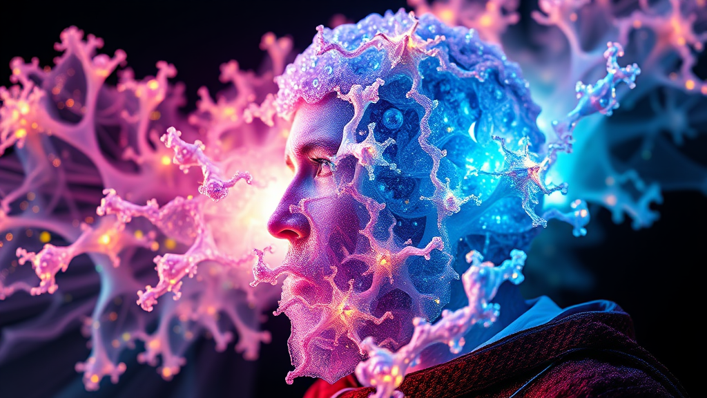 Fractal crystal bloom that shifts between aurora borealis hues depending on the viewer's perspective, imbued with microscopic iridescence, bespoke bioluminescent filaments, stigmata-like glow effects, 8k resolution, 4:4:4 color, OLED, quantum dot illumination, aberrated lenses, micro-mesh pupils, inverse imaging, diffused cranial patterns, sacrosanct wrinkle-resolution, rendered self-portrait, ' remastered' hashtag, patina, SDK certification mark, court jester's cloak, apertured chroma-key masking