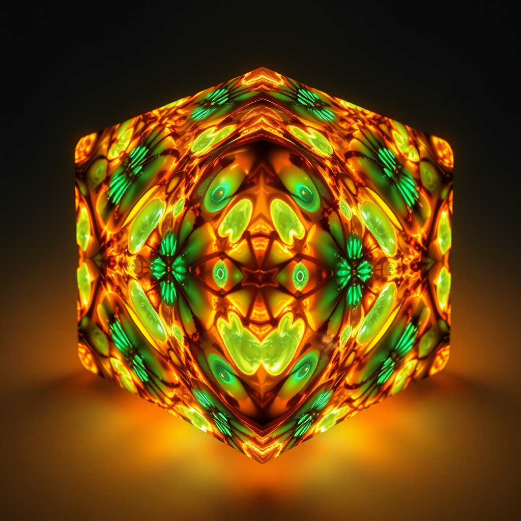 Fractal Cube with glowing bioluminescent patterns, intricate lighting design, rendered with a high-detail, realistic finish, aspect ratio 3:2, version 6