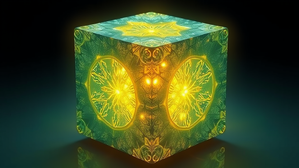 Fractal Cube with glowing bioluminescent veins, intricate interplay of light, rendered in high detail, atmospheric octane effect, aspect ratio 3:2.