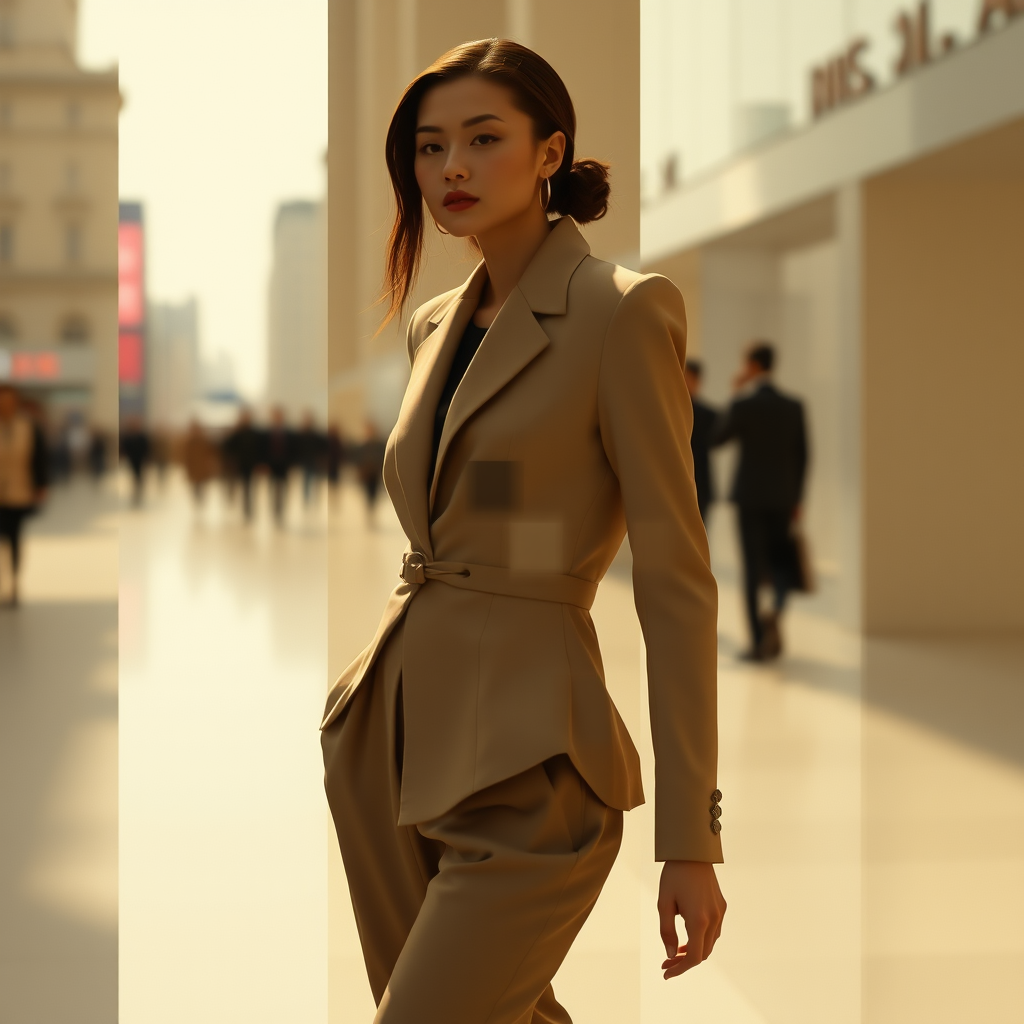 fractured pixel imagery, high fashion allure, luxury branding influence, soft neutral palette, slender silhouette, aspect ratio 4:5
