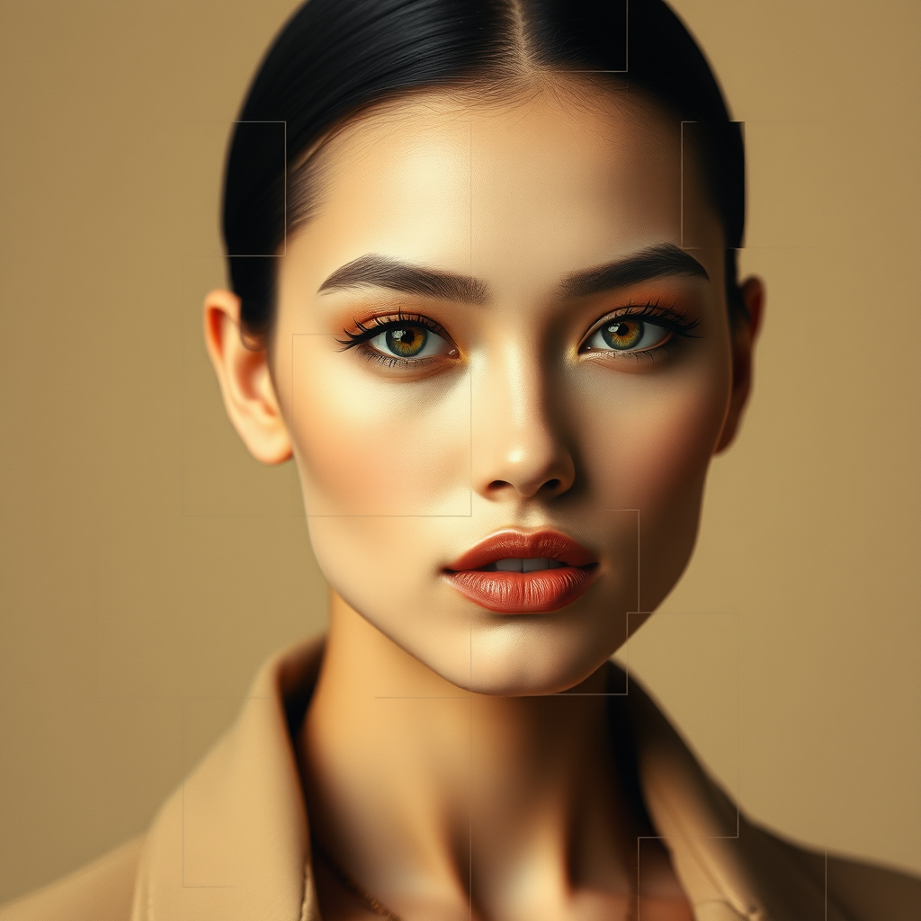 Fractured pixel portrait, high-fashion allure, luxury brand essence. Earthy beige palette, slender silhouette, with an avant-garde twist capturing timeless elegance.