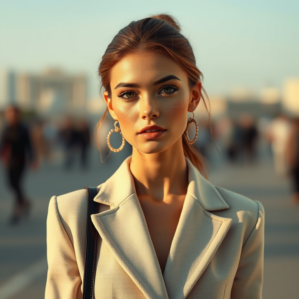 Fractured pixel visage, high fashion allure, luxury brand essence, warm neutrals, slender figure, --aspect ratio 4:5
