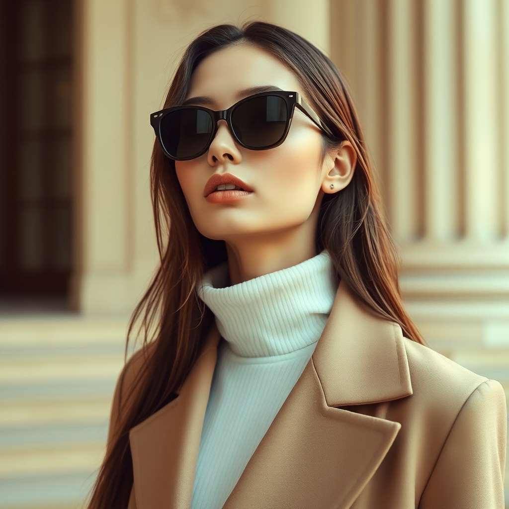 View this AI-generated image featuring fractured pixels portrait high fashion essence luxury brand vibe warm beige palette slender elegance aspect ratio 4 5. Created using advanced AI technology, this image showcases character art. Perfect for branding.