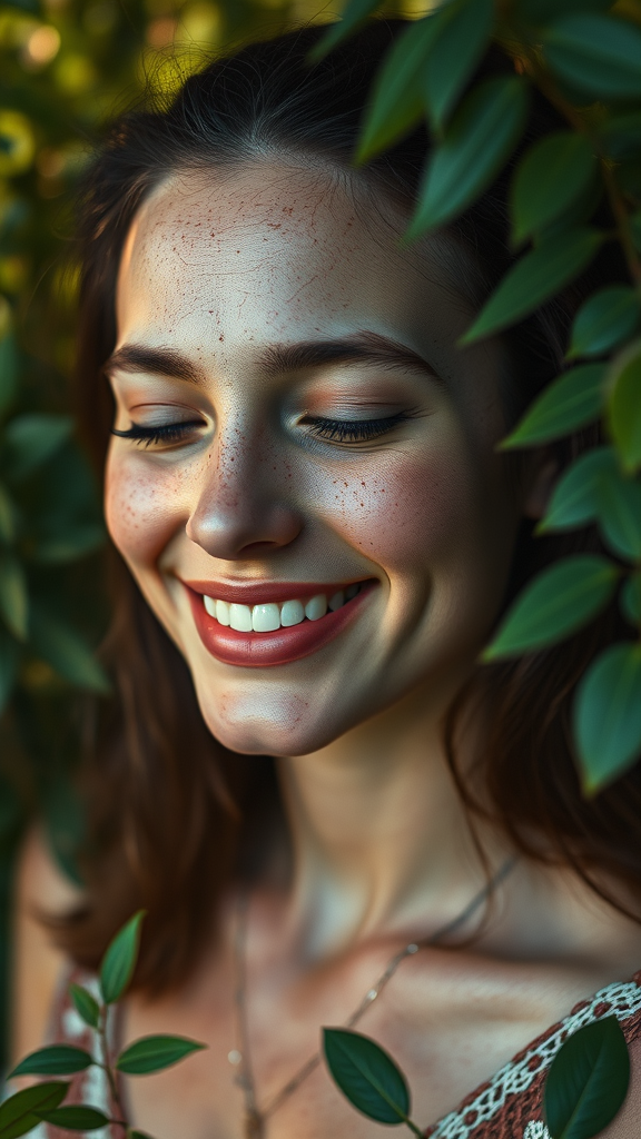 Freckled woman smiling softly, capturing an aura of tranquility and nature's embrace, blending calming essence with vibrant energy, photographed with provia for exquisite detail, showcasing figurative precision amid a sleepycore backdrop, exuding gentle and serene expressions against a lush, natural setting.