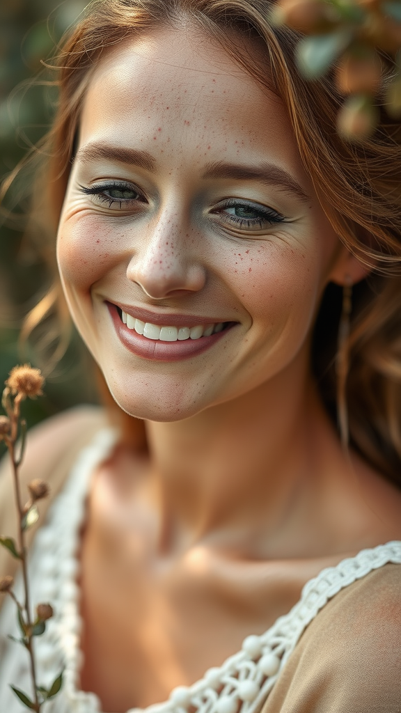 Freckled woman with a serene smile, embodying a calming and nature-inspired aura, captured in a style exuding subtle intensity and precision. The scene reflects a dreamy, gentle energy, with natural elements enhancing the tranquil mood, reminiscent of a photograph taken with vibrant hues and textures. The composition highlights soft, comforting expressions, evoking a sense of peacefulness and connection to nature.