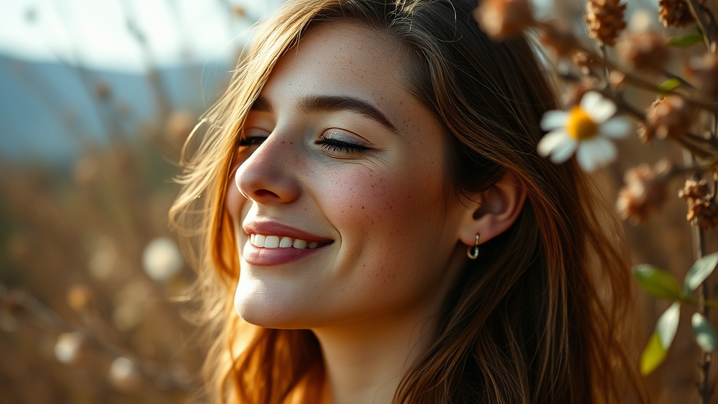 Freckled woman with a serene smile set against a backdrop of soothing naturecore aesthetics, emanating an intense yet peaceful energy; portrayed with the vivid colors and precision akin to a photo captured on Provia film. Her expression exudes a gentle tranquility as if imbued with a dreamy, sleepycore aura, harmonizing with the soft, natural surroundings. The scene encapsulates a blend of calming presence and vibrant detail, inviting a sense of quiet reflection and lively imagination.