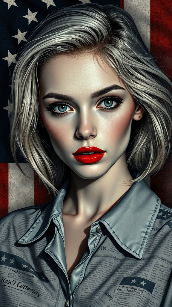 Fresco infused realism meets pop art featuring hints of blue, white, and red, capturing a close-up of a stunning blonde woman in an oxford collared dress adorned with red lipstick, set against the backdrop of vintage newspaper and the iconic American flag. This piece channels black and white intimacy reminiscent of Mike Deodato and Jan Frans van Bloemen, highlighting a slender figure that embodies gentle lyricism. Rich in detail and inspired by tenebrism, it evokes emotional distortion, drawing influences from Anton Fadeev, Lauren Faust, and Léon Bakst.