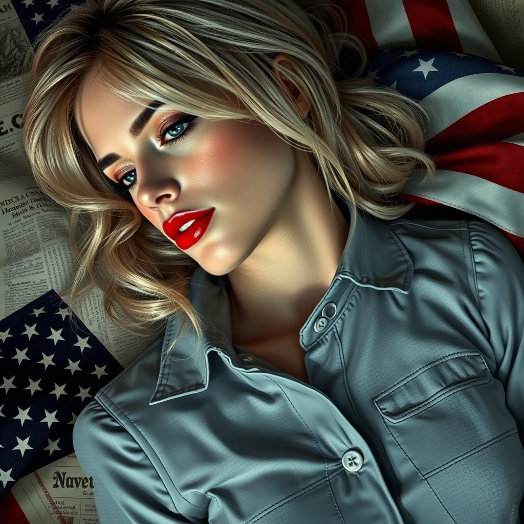 Fresco meets realism and pop art as a stunning blonde woman in a collared oxford dress with vivid red lipstick is portrayed atop an old newspaper and American flag. With subtle blue, white, and red accents, the scene showcases black-and-white intimacy reminiscent of Mike Deodato's style. Influences of Jan Frans van Bloemen emerge in her slender form and gentle lyricism. Details are lush and marked by tenebrism-inspired emotional distortion. The artistic vision channels the sensibilities of Anton Fadeev and Lauren Faust, combined with Léon Bakst's flair, focusing on a close-up that captures elegance and complexity.