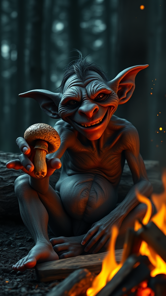 Friendly fantasy troll with a slender build and humanoid features, male, featuring elongated, thin ears that hang down, his intricately detailed face wrapped in a wide grin as he gazes playfully into the camera. Seated comfortably by a crackling campfire, he extends an inviting hand offering a plump mushroom toward the viewer. Set against the backdrop of a shadowy fir forest, the scene embodies the essence of dark fantasy. The composition is meticulously detailed, with elements of 3D fractals, twinkling light particles, and a surreal, shimmering ambiance that lends a perfect balance. Captured in octane render style and trending on artstation, the image resonates with 8k high-definition artistic photography. The scene is enveloped in a soft, natural volumetric cinematic light, capturing a photorealistic concept with unrivaled detail. His skin marked with natural textures, he sits unclad, without headgear or hair, embodying a surreal yet welcoming presence in this ethereal world.