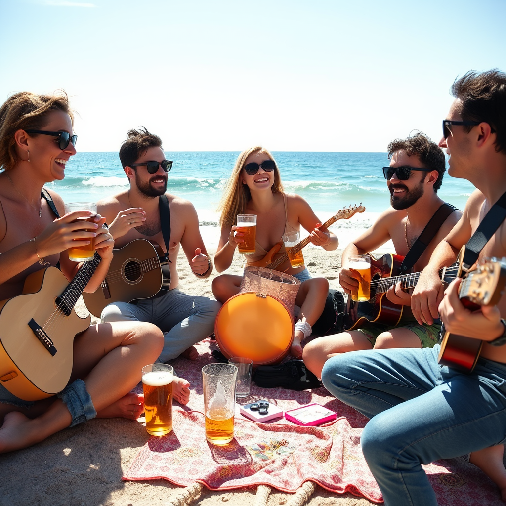 Friends, a band jamming on a sunny beach in the French Riviera, sipping on cold beers, laughter and music mingling with the sound of gentle waves in the background.