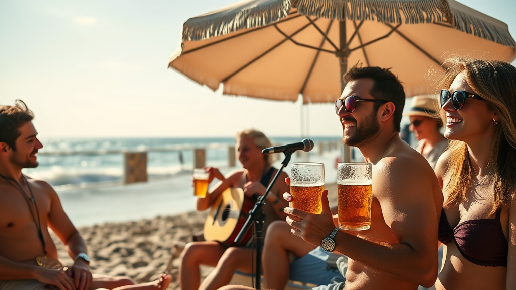 friends enjoying a beach day on the French Riviera, a lively band playing nearby, sipping cold beers under the sun, laughter and music mingling with the sound of the waves
