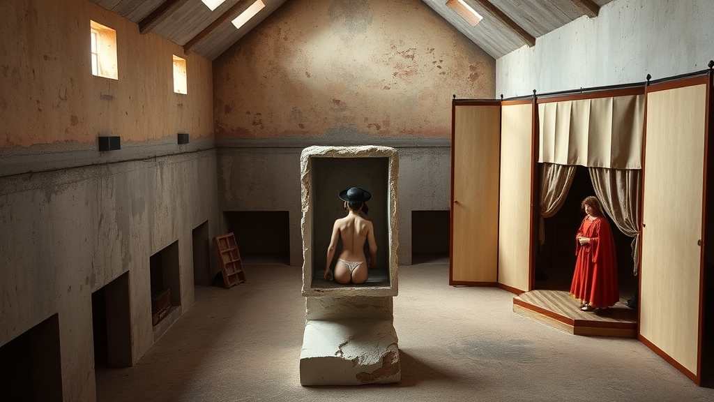 From a high vantage point, an expansive, dimly lit, and ancient space stretches out, seemingly untouched and forgotten. Echoes of the past reverberate through its vast emptiness, with scarce natural light seeping in through minuscule windows in the high ceiling. In the heart of this cavernous room stands a plaster sculpture shaped like a traditional wooden living room bookcase. It's slightly deteriorated, exposing parts of its metallic framework beneath the crumbling surface. An old 16mm film projector casts a black and white video onto this sculpture, depicting a half-naked Portuguese girl adorned with an urban hat. To the right, a sophisticated folding screen unfolds gracefully, crafted from paper with a sturdy wooden frame, evocative of a six-panel Japanese Nanban screen. Upon it, a lively color video portrays a biblical figure, draped in red and wearing sunglasses, set against a serene blue sky. On the left, there is a charming puppet theater, constructed from rich Alentejo textiles and fine wood. Tiny "Bonecos de Santo Aleixo" puppets are depicted at rest within this miniature stage, their size diminutive compared to the other sculptures. Despite their stature, these sculptures are dwarfed by the immense room, their presence illuminated only by the subtle glow of the projector beams, with the faintest whispers of daylight filtering down from above.