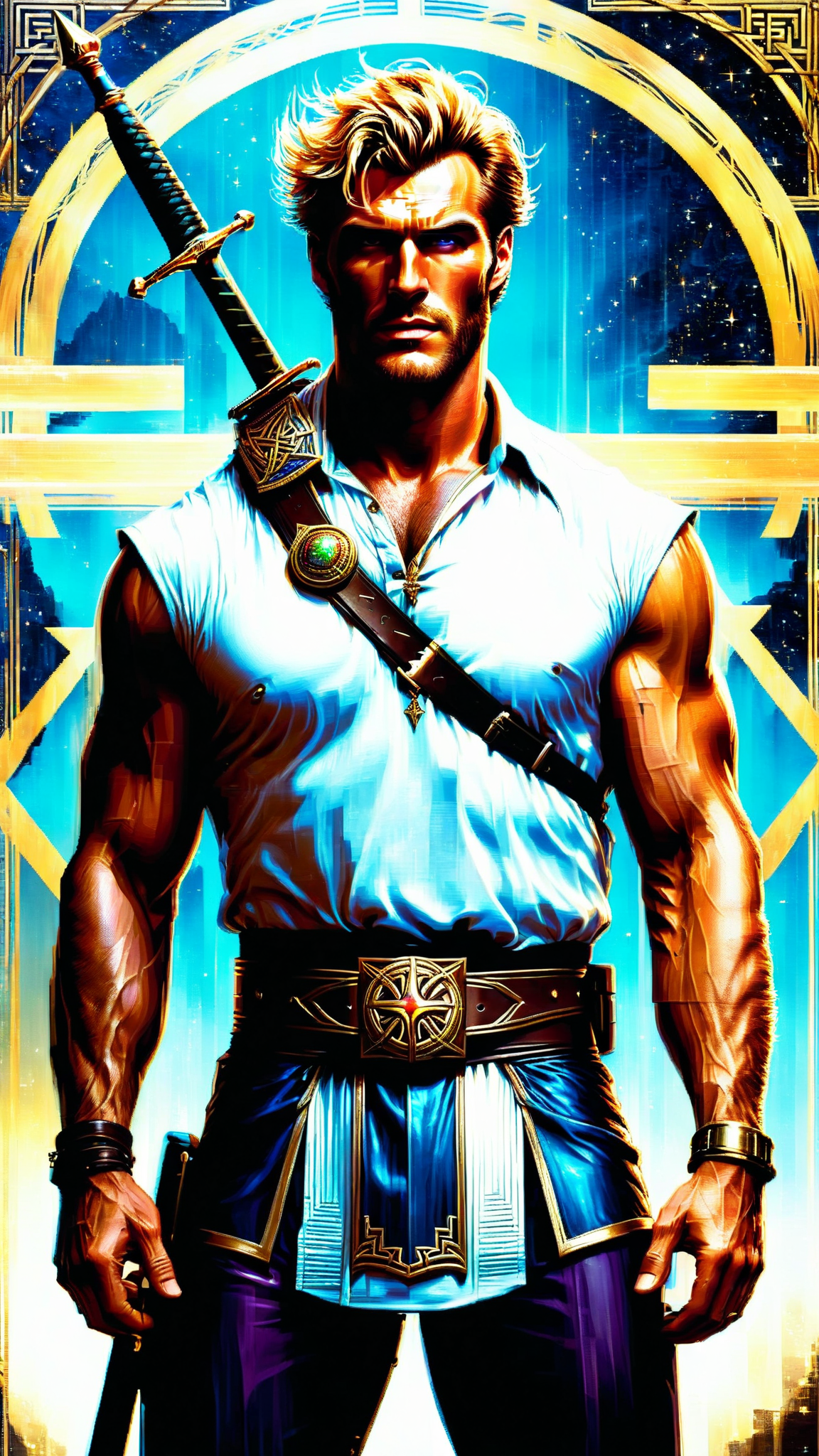 From the ancient Celtic lands, the world of Faeries and Fantasy. The Aes Sidhe, the Shining Ones, the Elves. They are warrior class artisians, immortals. They are radiant like the sun, dispelling the dark wherever they go. He is tall, masculine, muscular, strong. Lirhe but sinewy, wide shouldered, narrow waisted. Masculine handsome rugged face with strong brow and jaw, cleft chin, smooth hairless face. Opalescent eyes that shift and change with his mood. Golden blonde wavy fade hairstyle, short on sides and back, longer on top and combed back. He wears a gold headband/circlet around his head. Shiny gold pauldrons on his strong shoulders. Sleeveless white gossamer pearlescent shirt, unbuttoned to reveal his chest. Shiny gold chain with Amethyst gem pendant around his neck. Shirt tucked into tight, form fitting royal blue ranger/archer pants. Dark brown leather belt with golden Celtic belt buckle around his waist. Dark brown leather boots, brown leather bracers on his strong arms. Full body pose, his a ur an radiating light like the sun.