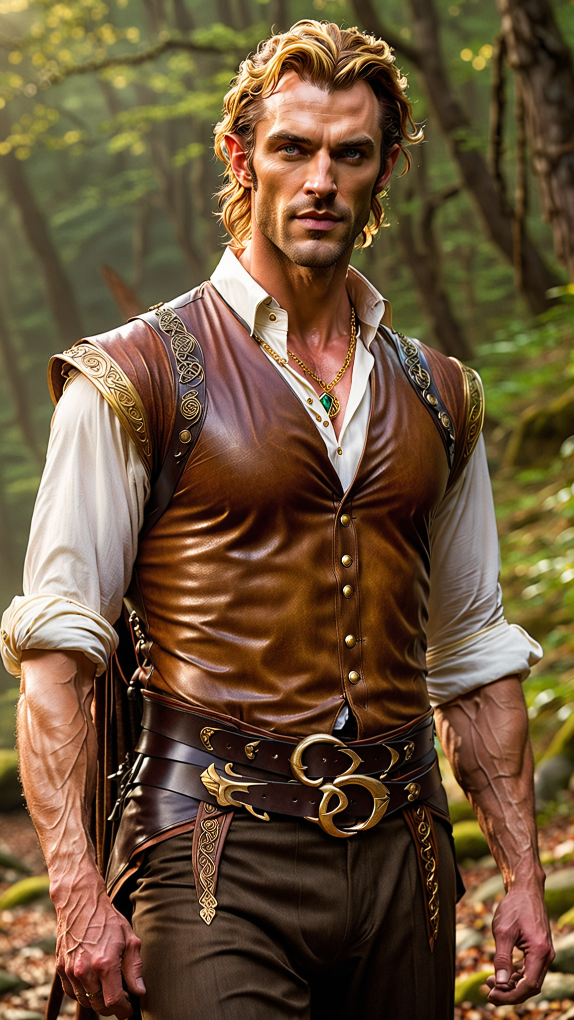 From the ancient Celtic lands, the world of Faeries and Fantasy. Ethereal, otherworldly, dreamlike. The Aes Sidhe, the Shining Ones, the Elves. They are warrior class artisians, immortals. They are radiant like the sun, dispelling the dark wherever they go. He is tall, masculine, muscular, strong. Lirhe but sinewy, wide shouldered, narrow waisted. Masculine handsome rugged face with strong brow and jaw, cleft chin, smooth hairless face. Opalescent eyes that shift and change with his mood. Golden blonde wavy fade hairstyle, short on sides and back, longer on top and combed back. He wears a gold headband/circlet around his head. Sharp elven ears. Shiny gold pauldrons on his strong shoulders. Sleeveless white gossamer pearlescent shirt, unbuttoned to reveal his chest. Shiny gold chain with Amethyst gem pendant around his neck. Shirt tucked into tight, form fitting royal blue ranger/archer pants. Dark brown leather belt with golden Celtic belt buckle around his waist. Dark brown leather boots, brown leather bracers on his strong arms. Full body pose, his a ur an radiating light like the sun.