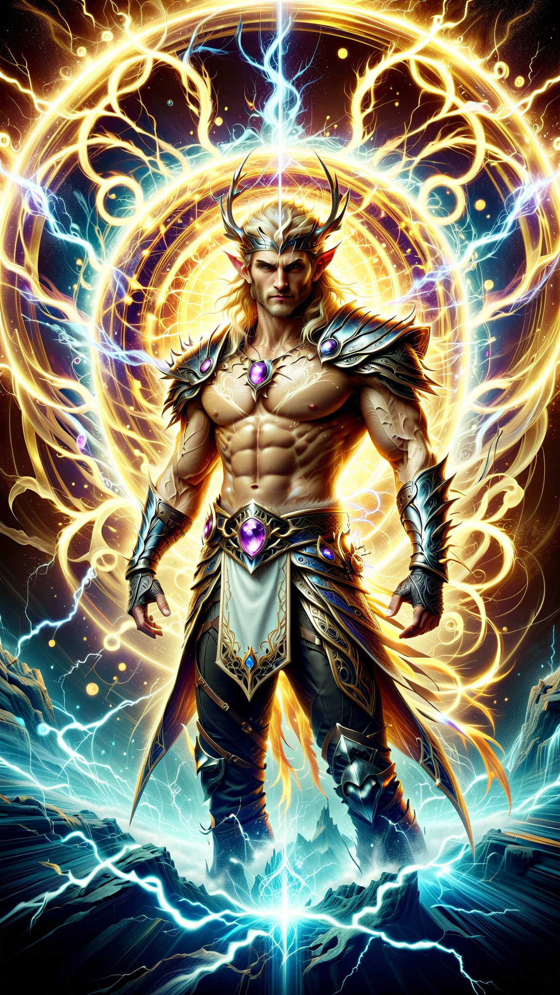 From the ancient Celtic lands, the world of Faeries and Fantasy. Ethereal, otherworldly, dreamlike. The Aes Sidhe, the Shining Ones, the Elves. They are warrior class artisians, immortals. They are radiant like the sun, dispelling the dark wherever they go. He is tall, masculine, muscular, strong. Lirhe but sinewy, wide shouldered, narrow waisted. Masculine handsome rugged face with strong brow and jaw, cleft chin, smooth hairless face. Opalescent eyes that shift and change with his mood. Golden blonde wavy fade hairstyle, short on sides and back, longer on top and combed back. He wears a gold headband/circlet around his head. Sharp elven ears. Shiny gold pauldrons on his strong shoulders. Sleeveless white gossamer pearlescent shirt, unbuttoned to reveal his chest. Shiny gold chain with Amethyst gem pendant around his neck. Shirt tucked into tight, form fitting royal blue ranger/archer pants. Dark brown leather belt with golden Celtic belt buckle around his waist. Dark brown leather boots, brown leather bracers on his strong arms. Full body pose, his a ur an radiating light like the sun.