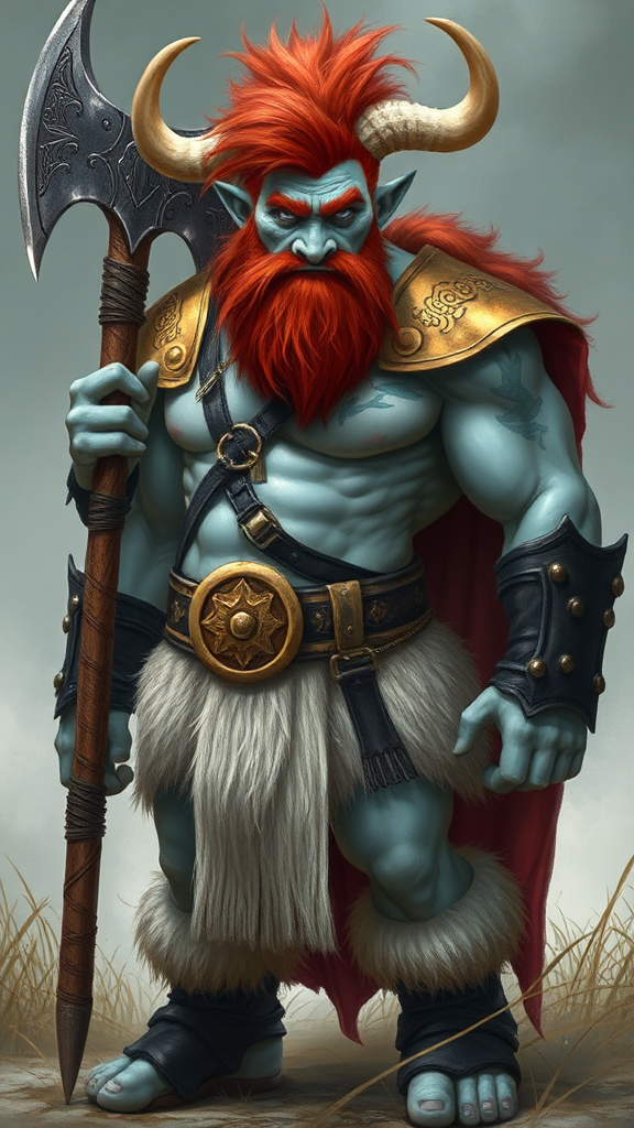 From the realm of faeries and fantasy. A handsome troll with pale blue skin (((blue skin))). Warrior, barbarian, giant. He wields a giant Viking war axe. Tall, strong, big muscles, muscular, sinewy, broad chested, wide back, narrow waist, bodybuilder. Short fiery red hair, mullet with fluffy middle-parted bangs. White steer horns curved upwards from the front of his temples. Handsome masculine rugged face, Icy blue eyes, strong brow and jaw. Dark red neatly trimmed Beard, close to face with sideburns. Golden pauldrons trimmed with black on broad shoulders. Black leather bondage harness on his bare chest, dark blue tribal tattoos on his chest. Black leather bracers on strong arms. White fur loincloth covering his girth, exposing strong muscular legs, a golden Viking styled belt trimmed with black around his waist. Knee-high black leather boots with white fur tops. A Scarlet-red short cape with golden-yellow Viking designs trim around the edges. Full body pose, axe raised in warrior stance, red hair in his armpits. {{MASTERPIECE}}