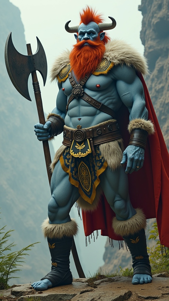 From the realm of faeries and fantasy. A handsome troll with pale blue skin (((blue skin))). Warrior, barbarian, giant. He wields a giant Viking war axe. Tall, strong, big muscles, muscular, sinewy, broad chested, wide back, narrow waist, bodybuilder. Short fiery red hair, mullet with fluffy middle-parted bangs. White steer horns curved upwards from the front of his temples. Handsome masculine rugged face, Icy blue eyes, strong brow and jaw. Dark red neatly trimmed Beard, close to face with sideburns. Golden pauldrons trimmed with black on broad shoulders. Black leather bondage harness on his bare chest, dark blue tribal tattoos on his chest. Black leather bracers on strong arms. White fur loincloth covering his girth, exposing strong muscular legs, a golden Viking styled belt trimmed with black around his waist. Knee-high black leather boots with white fur tops. A Scarlet-red short cape with golden-yellow Viking designs trim around the edges. Full body pose, axe raised in warrior stance, red hair in his armpits. {{MASTERPIECE}}