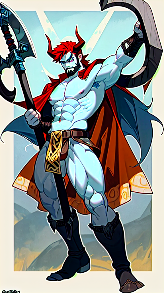 From the realm of faeries and fantasy. A handsome troll with pale blue skin (((blue skin))). Warrior, barbarian, giant. He wields a giant Viking war axe. Tall, strong, big muscles, muscular, sinewy, broad chested, wide back, narrow waist, bodybuilder. Short fiery red hair, mullet with fluffy middle-parted bangs. White steer horns curved upwards from the front of his temples. Handsome masculine rugged face, Icy blue eyes, strong brow and jaw. Dark red neatly trimmed Beard, close to face with sideburns. Golden pauldrons trimmed with black on broad shoulders. Black leather bondage harness on his bare chest, dark blue tribal tattoos on his chest. Black leather bracers on strong arms. White fur loincloth covering his girth, exposing strong muscular legs, a golden Viking styled belt trimmed with black around his waist. Knee-high black leather boots with white fur tops. A Scarlet-red short cape with golden-yellow Viking designs trim around the edges. Full body pose, axe raised in warrior stance, red hair in his armpits. {{MASTERPIECE}}