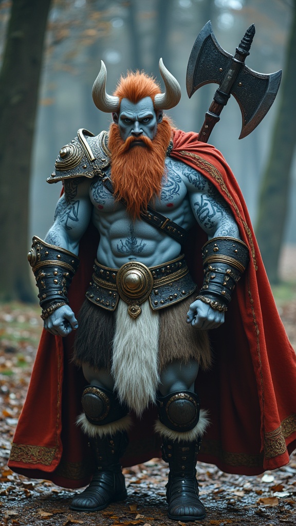 From the realm of faeries and fantasy. A handsome troll with pale blue skin (((blue skin))) Warrior. He wields a giant Viking war axe. Tall, strong, big muscles, muscular, sinewy, broad chested, wide back, narrow waist, bodybuilder. Short fiery red hair, mullet with middle-parted bangs. White steer horns curved upwards from the front of his temples. Handsome masculine rugged face, Icy blue eyes, strong brow and jaw. Dark red goatee, neatly trimmed. Golden pauldrons trimmed with black on broad shoulders. Black leather bondage harness on his bare chest, dark blue tribal tattoos on his chest. Black leather bracers on strong arms. White fur loincloth covering his girth, exposing strong muscular legs, a golden Viking styled belt trimmed with black around his waist. Knee-high black leather boots with white fur tops. A Scarlet-red short cape with golden-yellow Viking designed trim around the edges. Full body pose, axe raised in warrior stance. {{MASTERPIECE}}