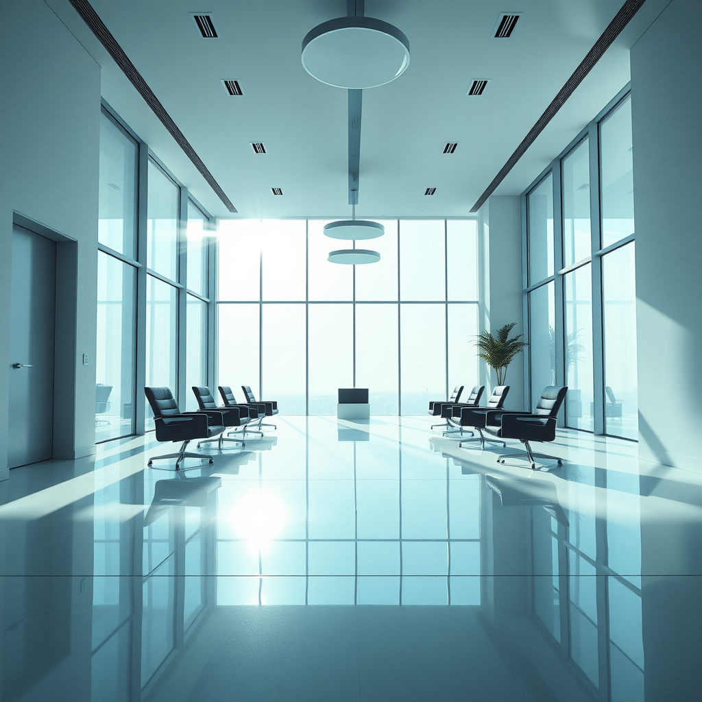 Front perspective of a sleek office setting, captured with a Sony A7R IV using an 85mm lens. The space embodies a contemporary minimalist style, featuring high-gloss surfaces and cool-toned lighting. The bright afternoon sun filters through large windows, casting dynamic shadows while modern light fixtures add a sophisticated ambiance.