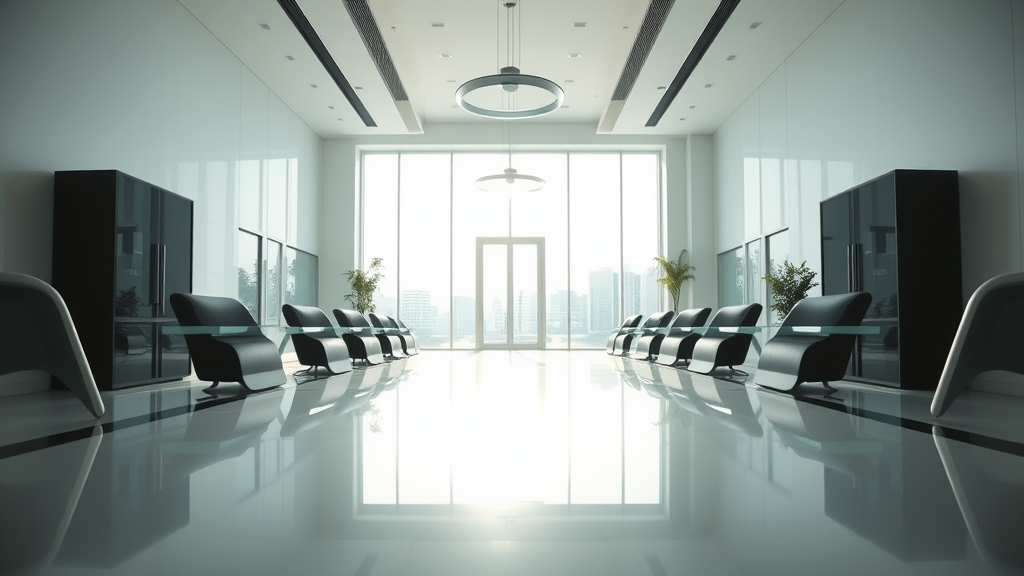 Front perspective of a sleek office space captured with a Sony A7R IV using an 85mm lens, showcasing a minimalist design with a sleek modern aesthetic. The scene is accented by cool-toned lighting complemented by the bright glow of afternoon sun streaming through large windows. Modern light fixtures provide an elegant touch, while high gloss surfaces reflect the calm and airy ambiance, adding a touch of sophistication to the contemporary setting.