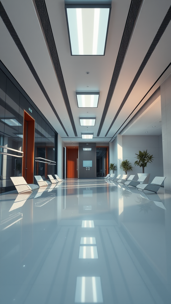 Front perspective, sleek office interior, captured with a Sony A7R IV and an 85mm prime lens, exuding a contemporary aesthetic with glossy surfaces. The scene is bathed in cool-toned lighting, enhanced by the vibrant afternoon sun, and features modern light fixtures that add a touch of elegance. The minimalist décor emphasizes clean lines and a spacious feel, maintaining a sense of professional sophistication.