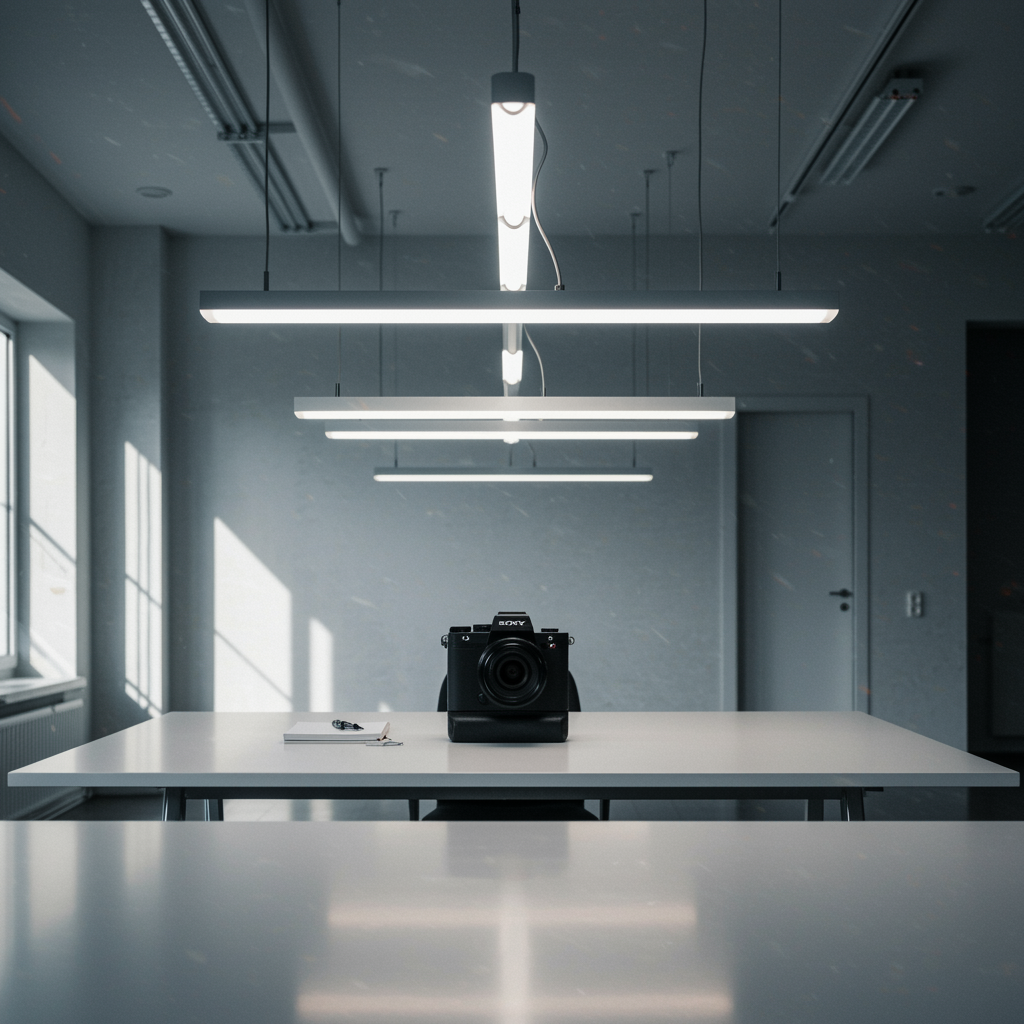 Front perspective, workspace, sleek design, captured with a Sony A7R IV using an 85mm lens, chic modern aesthetic, polished surfaces, cold-toned illumination, sunny afternoon ambiance, innovative lighting features, subtle creative adjustments reflecting minimalistic elegance.