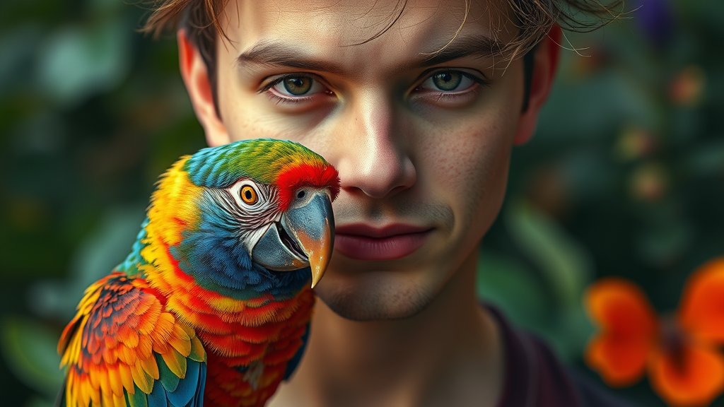 Front shot of a person with a colorful bird perched on their shoulder, ultra-realistic and highly detailed, captured with a 50mm lens, in 8k resolution, featuring dramatic cinematic lighting, emphasizing vivid textures and expressions, accented with elements of vibrant nature in the background.