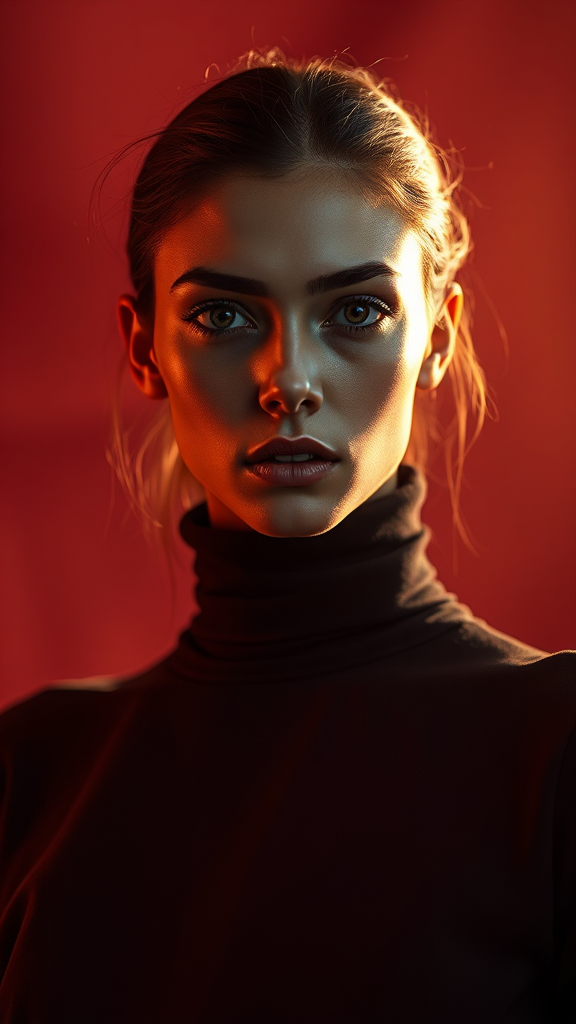 Front shot, upper body of a professional model with Greek dark features, distinct eyes of blue and brown hues, captured using a Hasselblad X2D 100C with XCD 90mm f/2.5 lens. The scene is set with a cinematic red color grading infused with golden hour warmth. The model strikes an avant-garde composition with a tilted head, maintaining a profound gaze directly at the camera. The elongated posture is accentuated by a flowing black turtleneck. Lighting includes a professional Fresnel light positioned at a 60-degree angle with silk diffusion and a rim light featuring a CTO gel at a 75-degree angle. An ethereal atmosphere is achieved with a haze machine, feathered shadows, and contrast curve manipulation. The image undergoes selective dodge and burn, with a grain texture overlay and color temperature transitioning from 5500K to 3200K. Ultra-sharp details permeate the scene, inspired by Paolo Roversi's lighting technique. The dynamic backdrop transitions through a burnt umber to red ruby gradient, embodying hyper-realism with intricate detail in 16K resolution.