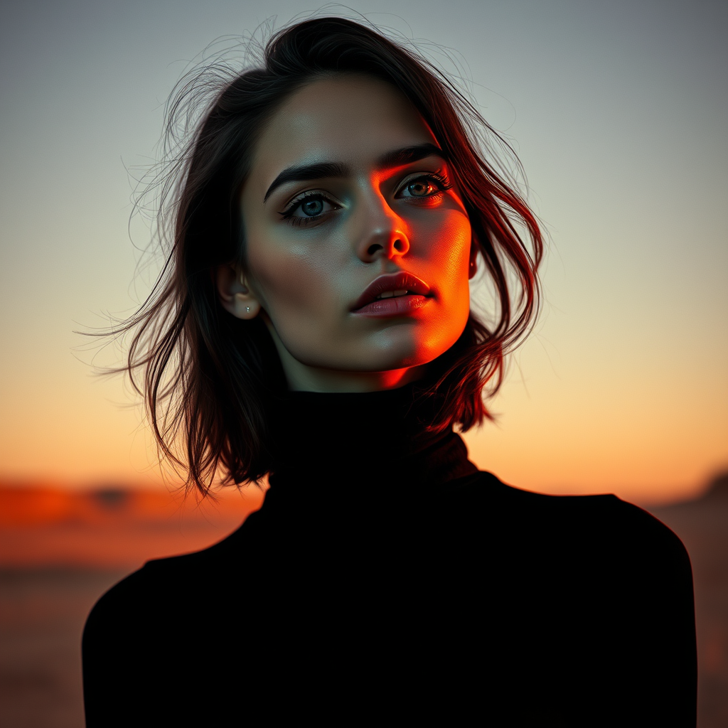 Front shot upper body portrait featuring a professional model with striking Greek-inspired complexion, distinguished by heterochromia displaying one blue and one brown eye. Captured using a Hasselblad X2D 100C with an XCD 90mm f/2.5 lens, the image is infused with cinematic red hues and the warmth of golden hour. The composition is avant-garde, showing a model with a tilted head and profound gaze, portraying an elongated stance in a flowing black turtleneck. The lighting arrangement includes a main Fresnel light diffused with silk at a 60-degree angle, complemented by a rim light with a CTO gel set at a 75-degree angle. A haze machine enhances the ethereal atmosphere, with feathered shadows and contrast curve manipulation adding depth. Dodge and burn techniques are selectively applied, and a grain texture overlay enriches the image. The color temperature shifts from 5500K to 3200K, while ultra-sharp details are maintained, delivering a hyper-realistic finish. Captured in raw format, the photo draws inspiration from Paolo Roversi's lighting techniques, showcasing rich, 16K detail amid a burnt umber to ruby red gradient backdrop, style raw, personalize nq7rq2j, stylize 500, v 6.1.