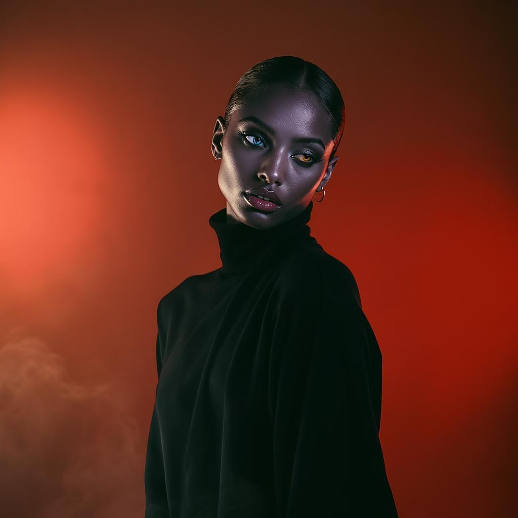 Front shot upper body portrait of a professional model with striking Greek dark facial features and heterochromia, one eye blue and the other brown. Captured using a Hasselblad X2D 100c with an XCD 90mm f/2.5 lens, the image is infused with a cinematic red tone and golden hour warmth. The model poses avant-gardely with a tilted head and an intense gaze, elongated stance accentuated by a flowing black turtleneck. The backdrop fades from burnt umber to a rich ruby red, adding depth to the dramatic black silhouette. A main Fresnel light at a 60-degree angle, softened with silk diffusion, highlights the model, complemented by a rim light with CTO gel at a 75-degree angle and a haze machine for an ethereal atmosphere. Shadows are delicately feathered with contrast curve manipulation and selective dodge and burn techniques applied. A grain texture overlay enhances the image, which transitions from a color temperature of 5500K to 3200K. Hyper realistic and ultra-sharp details are coupled with a Paolo Roversi-inspired lighting style. The image, intended for 16K resolution, is rich in detail and personalized to the stylizations --ar 9:16 --quality 2 --style raw --personalize nq7rq2j --stylize 500 --v 6.1.