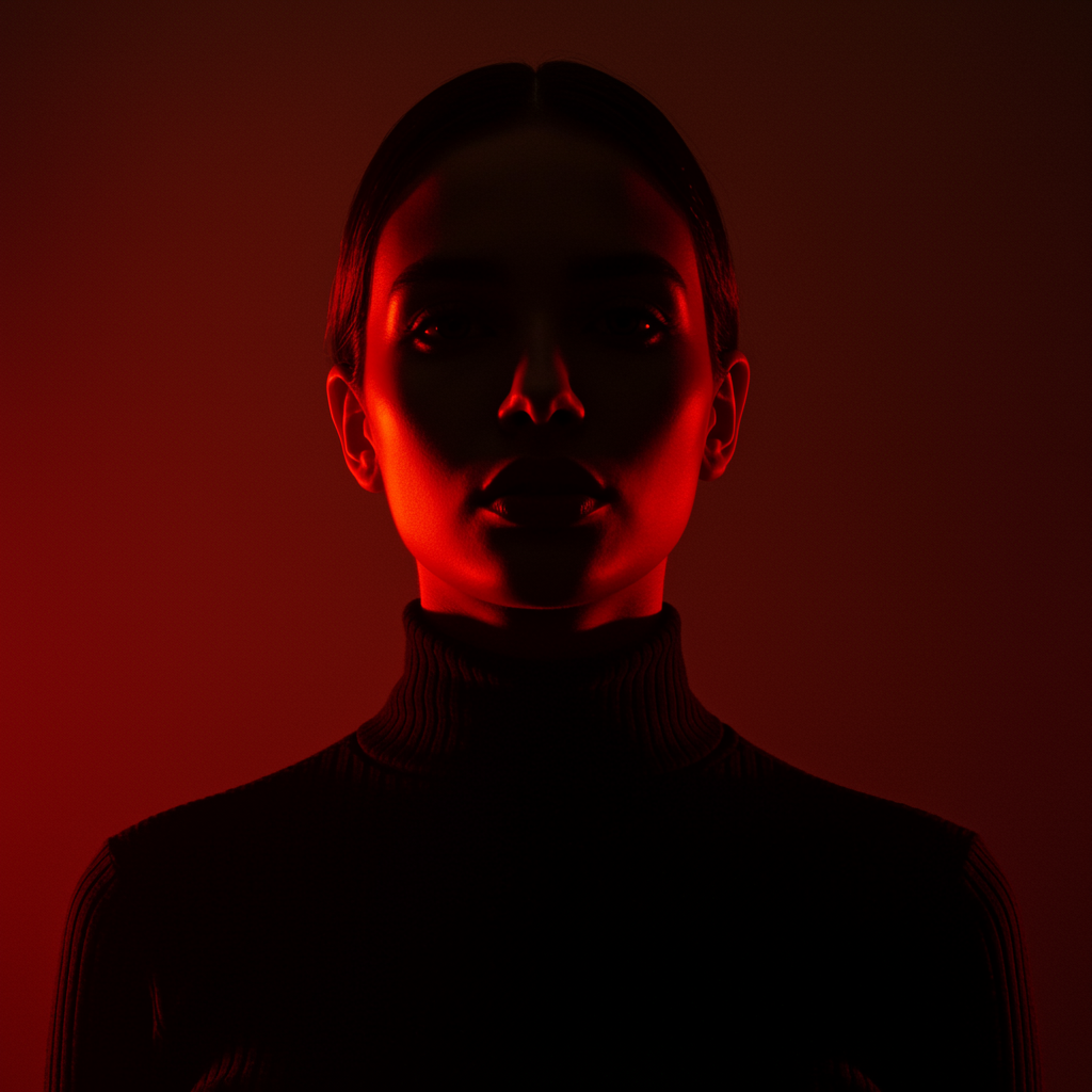 Front shot, upper body, professional model with Greek dark facial features, heterochromatic eyes—one blue, one brown—captured using a Hasselblad X2D 100C with an XCD 90mm f/2.5 lens. The scene is bathed in a cinematic red color grading with the warmth of golden hour, featuring a dramatic black silhouette set against a gradient backdrop of burnt umber to deep red ruby. The model strikes an avant-garde composition with a tilted head pose and a profound gaze. Her elongated stance is accentuated by a flowing black turtleneck, illuminated by a main Fresnel light positioned at a 60-degree angle, combined with silk diffusion. A rim light enhanced with a CTO gel is set at a 75-degree angle, enhancing the ethereal atmosphere created by a haze machine. Feathered shadows and a well-defined contrast curve are employed, with selective dodge and burn techniques. An overlay of grain texture complements the scene, where the color temperature transitions from 5500K to 3200K. Ultra-sharp details in raw format capture hyper-realistic elements, inspired by the lighting techniques of Paolo Roversi. This image is rendered in rich detail, 16K resolution, maintaining the integrity of the original concept with minor creative adjustments.
