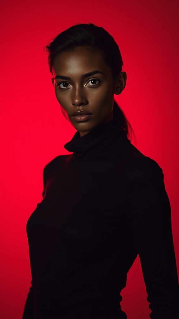 Front view capturing the upper body of a professional model with striking Greek dark facial features and heterochromatic eyes—one blue, one brown. Photographed using a Hasselblad X2D 100C coupled with an XCD 90mm f/2.5 lens. The mood is set with cinematic red color grading, enhancing the golden hour warmth. The composition features a dramatic black silhouette against a backdrop fading from burnt umber to a rich ruby red. The model's avant-garde pose has a subtly tilted head, offering a profound gaze directly at the camera. The elongated body is gracefully adorned with a flowing black turtleneck. Lighting is precise: a main Fresnel light set at a 60-degree angle with silk diffusion casts a soft glow, while a rim light with CTO gel at 75 degrees adds depth. A haze machine creates an ethereal atmosphere with feathered shadows. The visual dynamics are elevated by contrast curve manipulation, selective dodge and burn techniques, and a grain texture overlay. The scene transitions smoothly from a 5500K to 3200K color temperature, captured in ultra-sharp details with a hyper-realistic feel, inspired by Paolo Roversi’s lighting. The final image is rich in detail, with an impressive 16K resolution, reflecting a personalized touch in the style of nq7rq2j with a stylize factor of 500 and high-quality rendering in version 6.1.