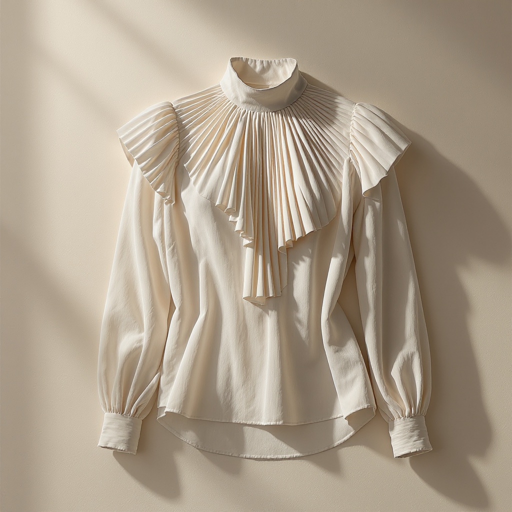 View this AI-generated image featuring front view of a blouse design showcasing a high neckline and elegant pleats starting from the shoulders designed by cristobal balenciaga with a neutral color palette exhibiting the soft interplay of crepuscular rays on a clean beige background rendered in octan
