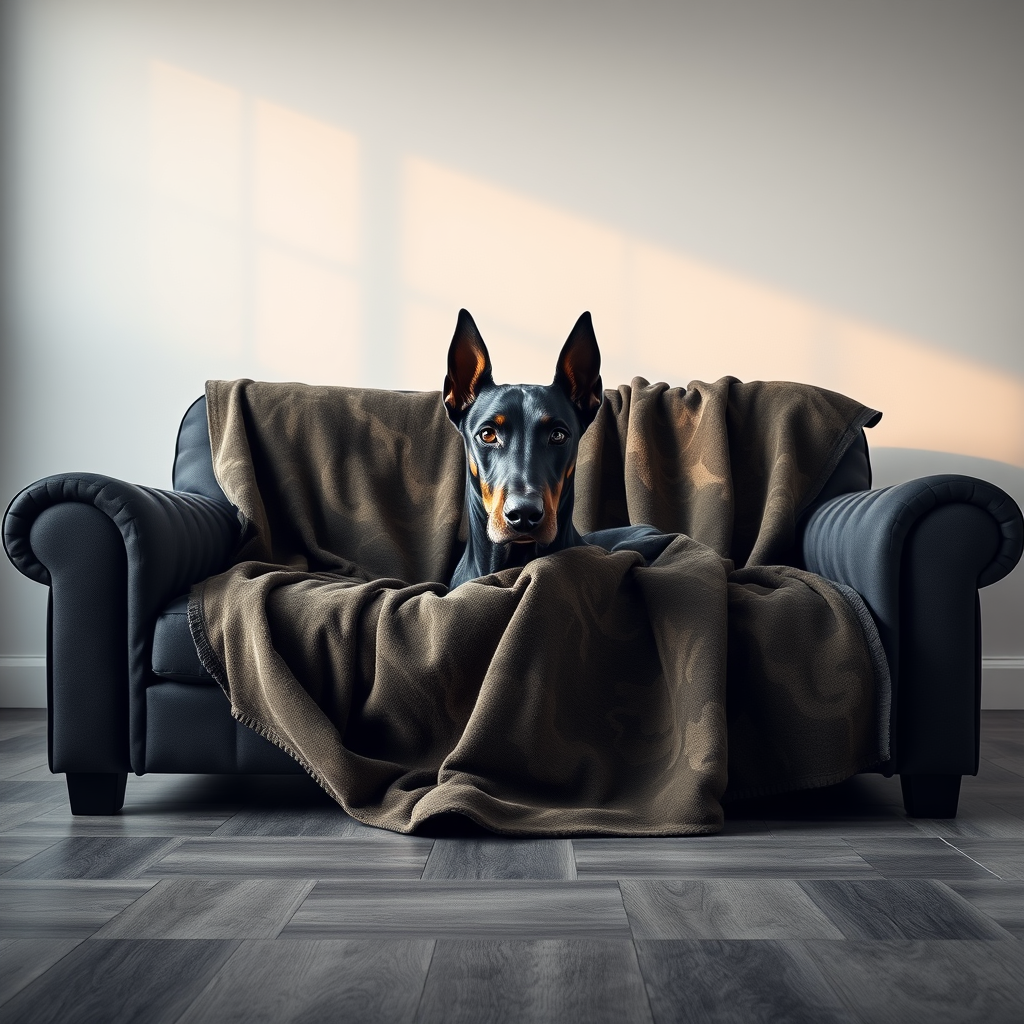 Front view in a minimalist photo studio setting showcasing a camouflage pattern blanket draped over a dark camouflage-textured sofa. Focus on the intricate details of the blanket, featuring a black Doberman partially covered, gazing intently into the camera. The scene captures the essence of realism with dusk sunlight casting soft highlights, adding depth and dimension. Ultra high-definition resolution enhances the texture and colors, emphasizing the raw style and artistic flair of the composition.