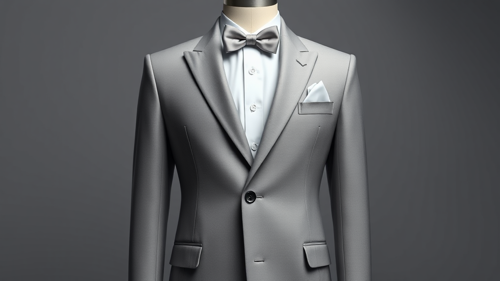 Front view of a blazer with elegant tailoring, showcasing a stylish bowtie and a neatly folded pocket square at the lapel, photographed from a slightly angled perspective, inspired by Calvin Klein's design aesthetics, featuring a sophisticated color palette, subtle backlighting, and a minimalist gray background, rendered with an Unreal engine and V-ray finish, aspect ratio 2:3, high quality, without any mannequin.