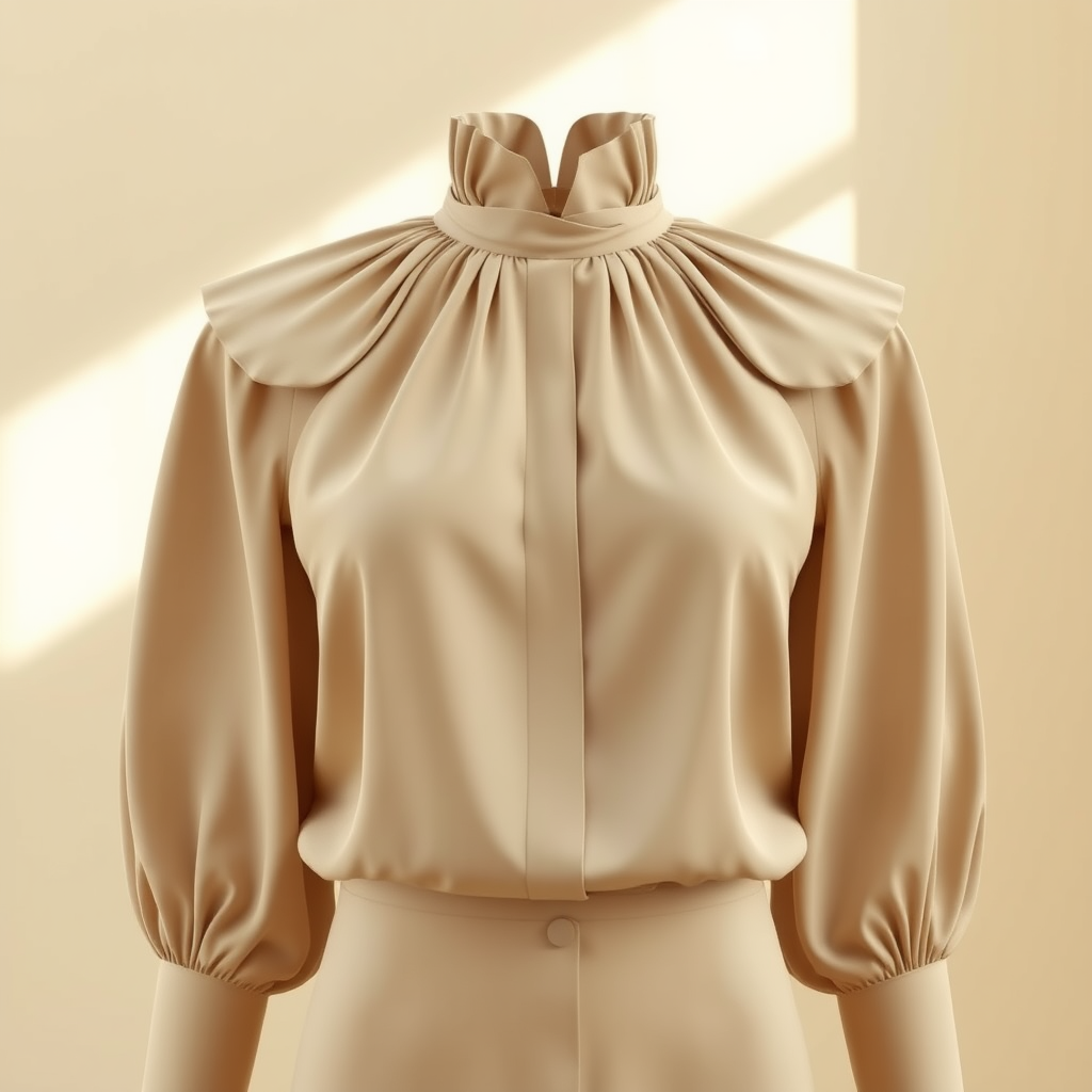 Front view of a blouse design with a sophisticated high neckline and elegantly arranged pleats at the shoulders, inspired by Cristobal Balenciaga. The garment is presented in a subtle neutral color palette, complemented by soft crepuscular rays. Set against a clean, understated beige background, the blouse exudes timeless elegance. Rendered with Octane and V-ray, the scene highlights intricate fabric details and delicate craftsmanship, while maintaining a sense of natural beauty and minimalist charm.