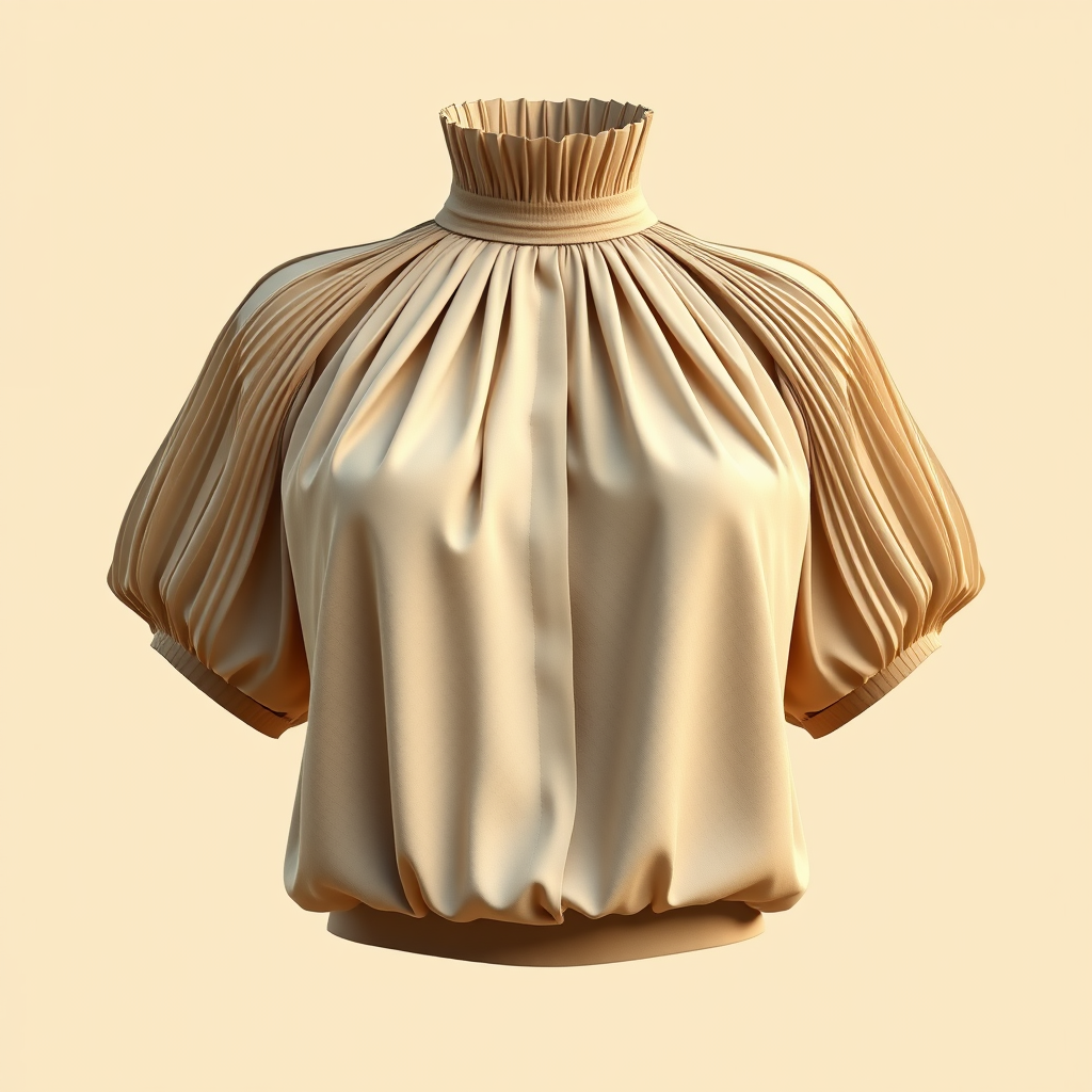 Front view of a blouse design with a structured high neckline and elegant pleats extending from the shoulders, inspired by Cristobal Balenciaga, in a sophisticated neutral color palette. The blouse is illuminated by soft Crepuscular rays, against a minimalist clean beige background, rendered in Octane with V-ray qualities, emphasizing texture and detail. The focus is solely on the blouse itself, maintaining a classic yet modern aesthetic with subtle artistic touches.