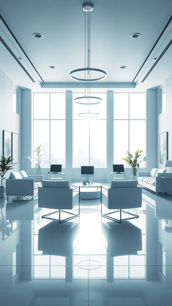 Front view of a contemporary office space, captured with a Sony A7R IV using an 85mm lens. The room exudes a minimalist aesthetic with sleek, modern furniture and high-gloss finishes. Cool-toned lighting blends with the bright afternoon sun pouring through large windows, creating a serene yet energetic atmosphere. Elegant, modern light fixtures add a touch of sophistication, while subtle art pieces enhance the clean lines and open feel of the space.