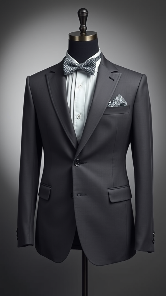 Front view of a meticulously tailored blazer featuring a subtly patterned bowtie and an elegantly folded pocket square at the lapel, captured from a sophisticated side angle, inspired by Calvin Klein's design ethos, showcasing a refined and contemporary color palette. Against a softly lit, minimalist gray backdrop with gentle backlighting, the attire exudes a sense of polished sophistication, rendered with the realism of Unreal Engine and V-Ray for an immersive visual experience, maintaining an artistic depth without a mannequin presence.